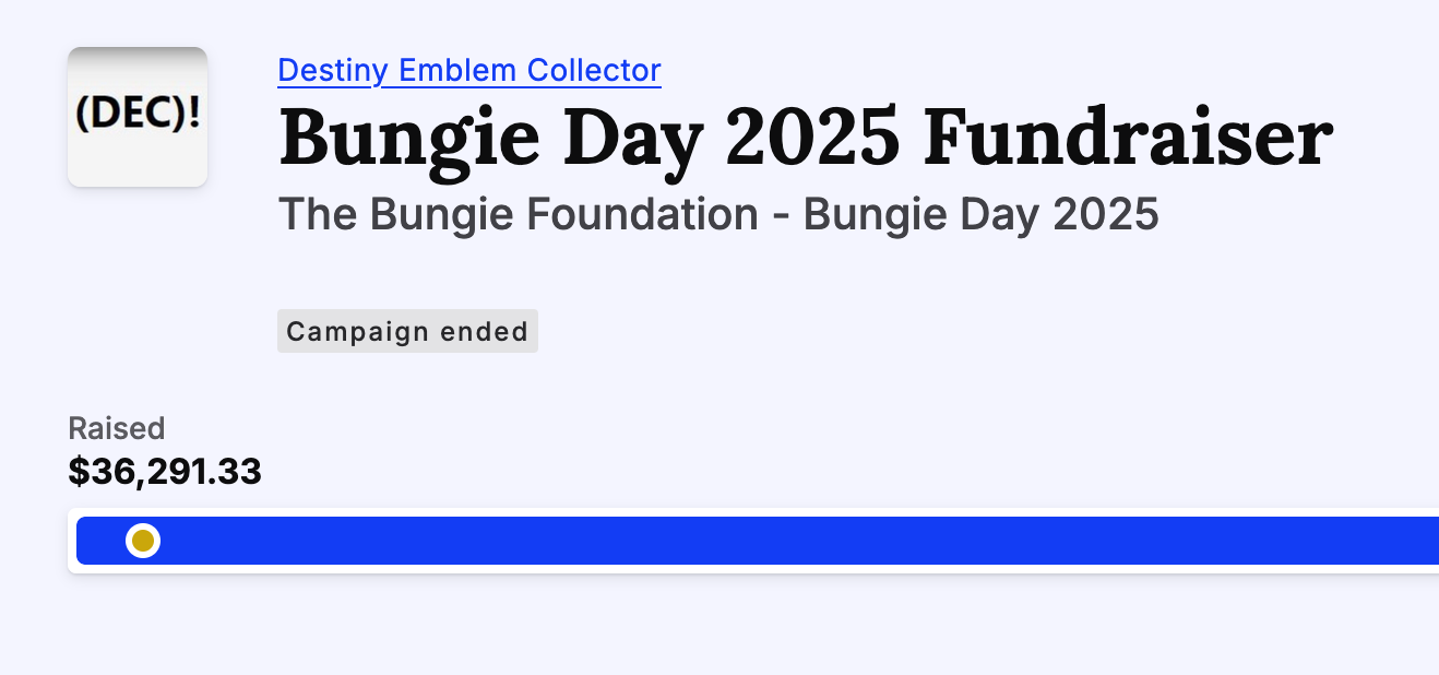 A huge, huge thank you to everyone who donated during this fundraiser! We raised an amazing $36,291.33 for @BungieLove! That means I'm super close to a lifetime total of $300,00! Thank you all for your generosity over the years! π