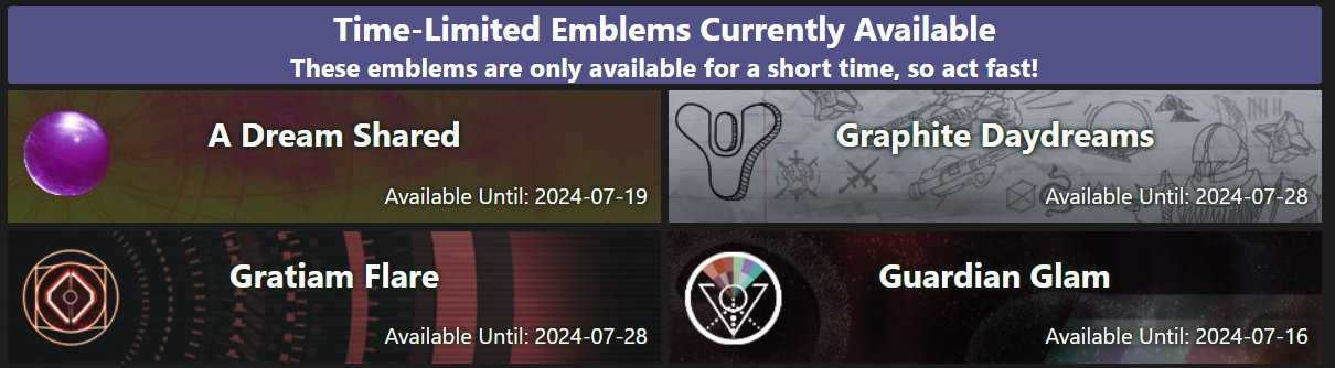 I updated the Bungie Foundation and GCX emblems on the front page; I had the wrong end dates for most of those. Sorry about that!