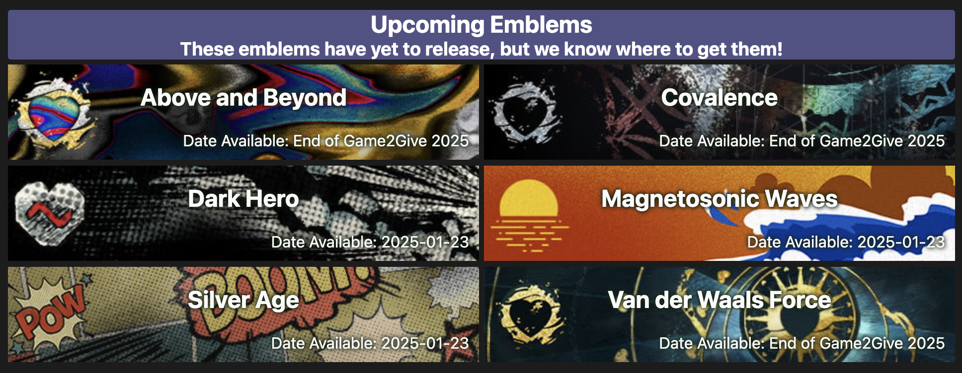 Updated all of the @BungieLove Game2Give 2025 emblems on the front page. Please note the different dates for the lifetime donation emblems. My fundraiser link will go live on January 23rd!